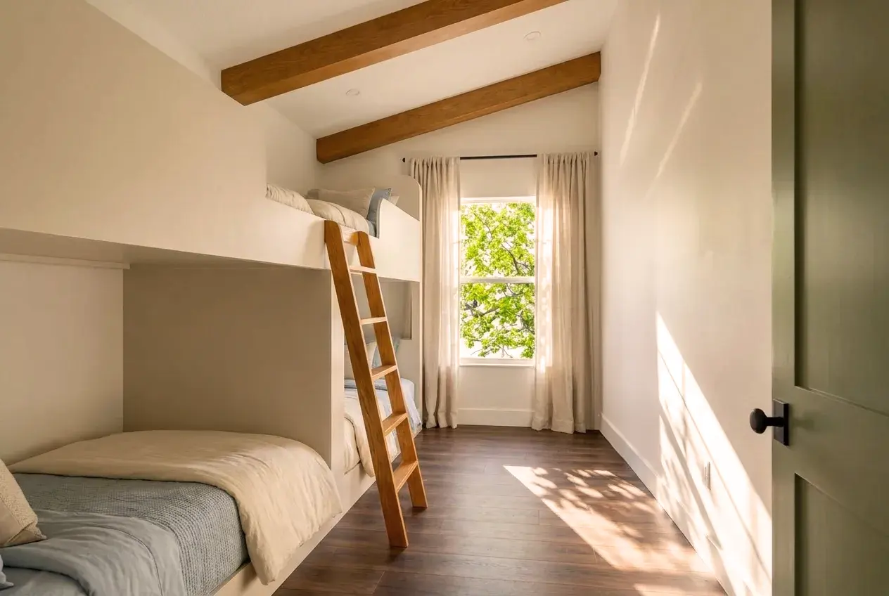 To address the challenges of family density within an urban context, the secondary sleeping quarters feature a high-efficiency vertical “intervention.” This room is engineered to accommodate four children through an innovative, multi-level bunk system.